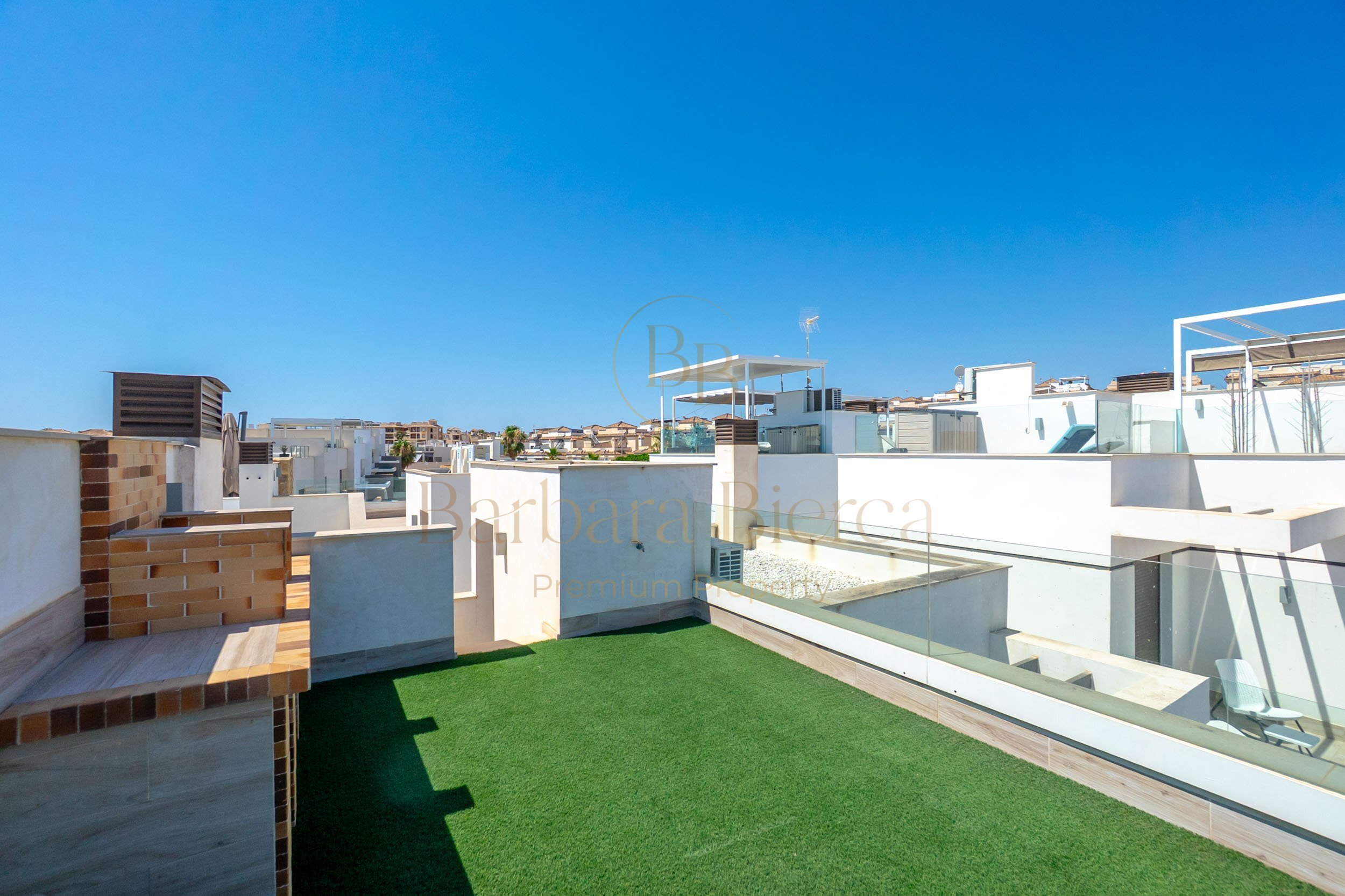 Na piętrze umieszczono dwie przestronne sypialnie z wbudowanymi szafami oraz prywatnymi balkonami – idealne na poranną kawę lub wieczorny relaks. Jasna, w pełni wyłożona kaflami łazienka została wykończona w nowoczesnym stylu. Na najwyższym poziomie znajduje się prywatny taras na dachu z grillem, zlewem oraz miejscem na leżaki i stół jadalny – idealne miejsce do wypoczynku i podziwiania widoków.